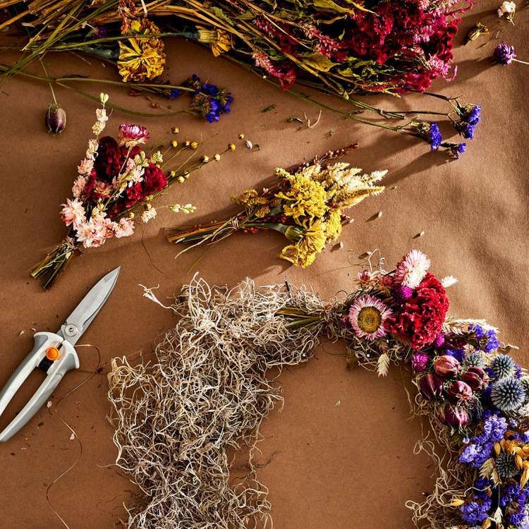 Bild und Idee und deataillierte Anleitung auf: https://www.midwestliving.com/how-to-make-a-dried-flower-wreath-8689949